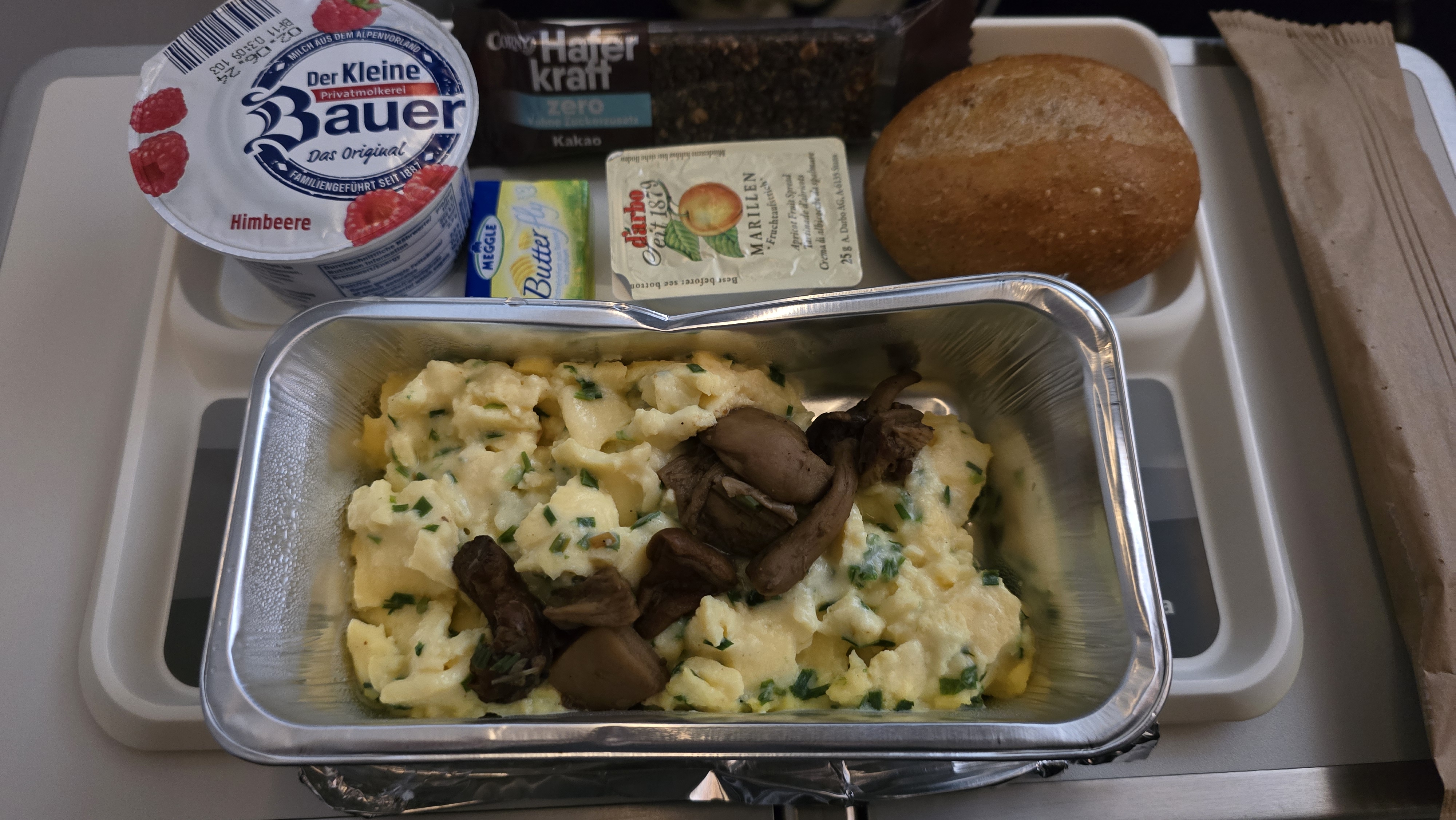 긴 비행 시간이 지난 후 베이징 도착 전, 마지막에 아침 메뉴로 먹은 버섯과 스크램블 에그예요.