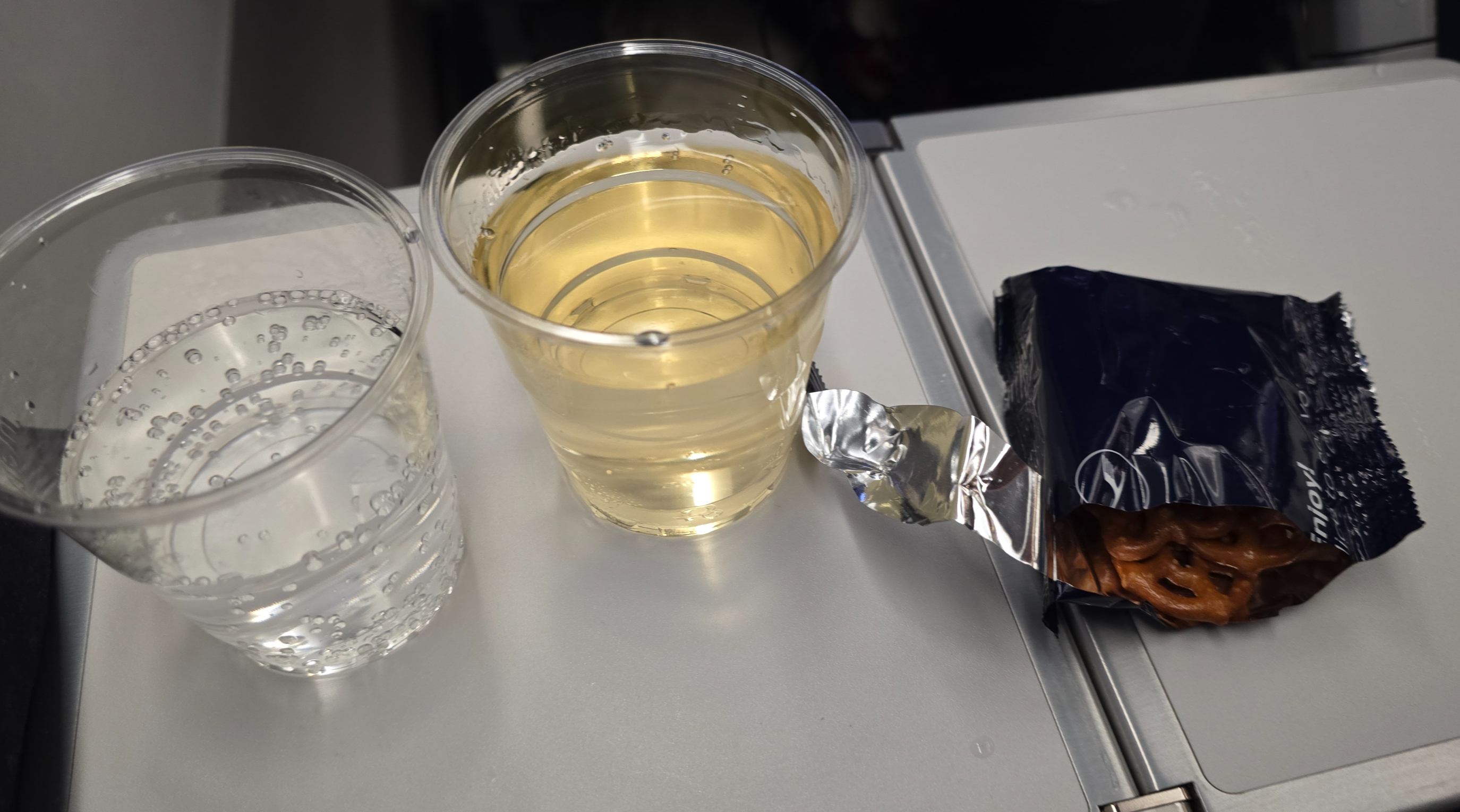 화이트 와인 한 잔과 프레첼, 탄산음료까지 알차게 챙겨 먹었어요.