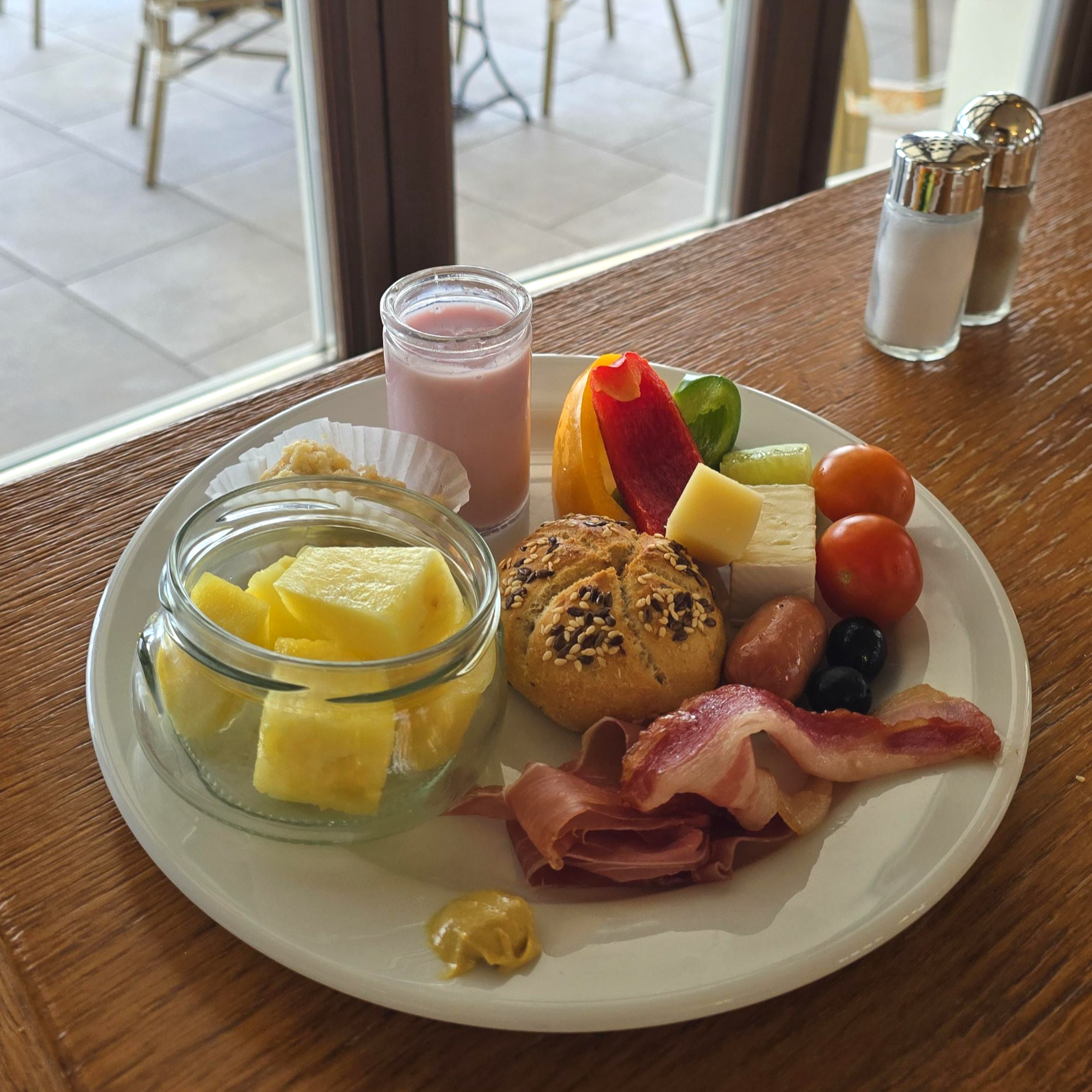 다음으로 베이컨과 스크램블 에그, 삶은 계란과 페타 치즈 등 곁들여 먹기 좋은 음식들과 함께 간단한 야채가 준비되어 있었습니다. 유럽에서 조식 드셔본 분들은 아시겠지만 대부분 빵, 햄, 치즈 등은 다양하게 잘 나오더라고 함께 곁들일만한 야채와 과일 등은 부족한 경우가 많은데요. 호텔 피란은 야채와 과일들이 비교적 다양하게 있어서 더 반갑게 느껴졌어요.