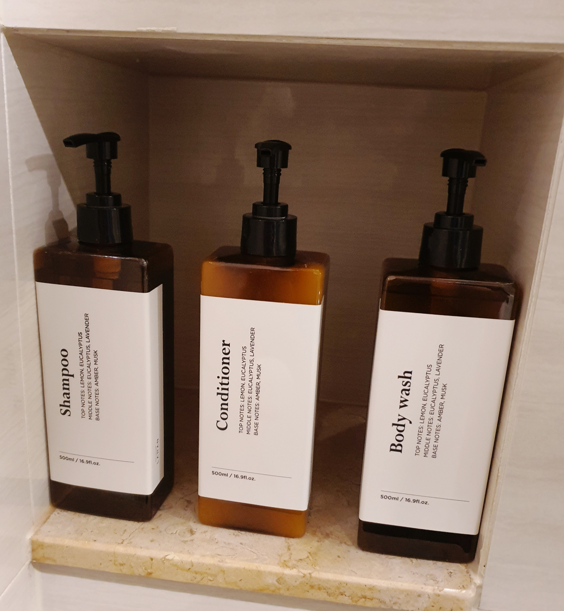 샤워실에는 샴푸, 컨디셔너, 바디워시 제품이