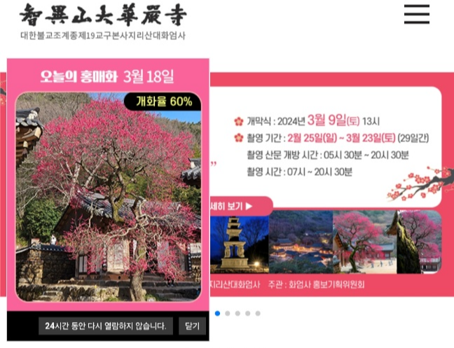 공식 사이트에 들어가면 위에 사진처럼 오늘의 홍매화 사진을
