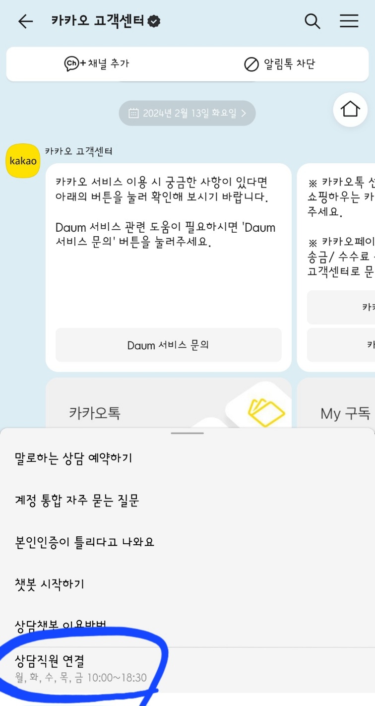 저는 고객센터 내의 화면에서 카톡 챗봇상담으로 실시간 상담을 진행했습니다.