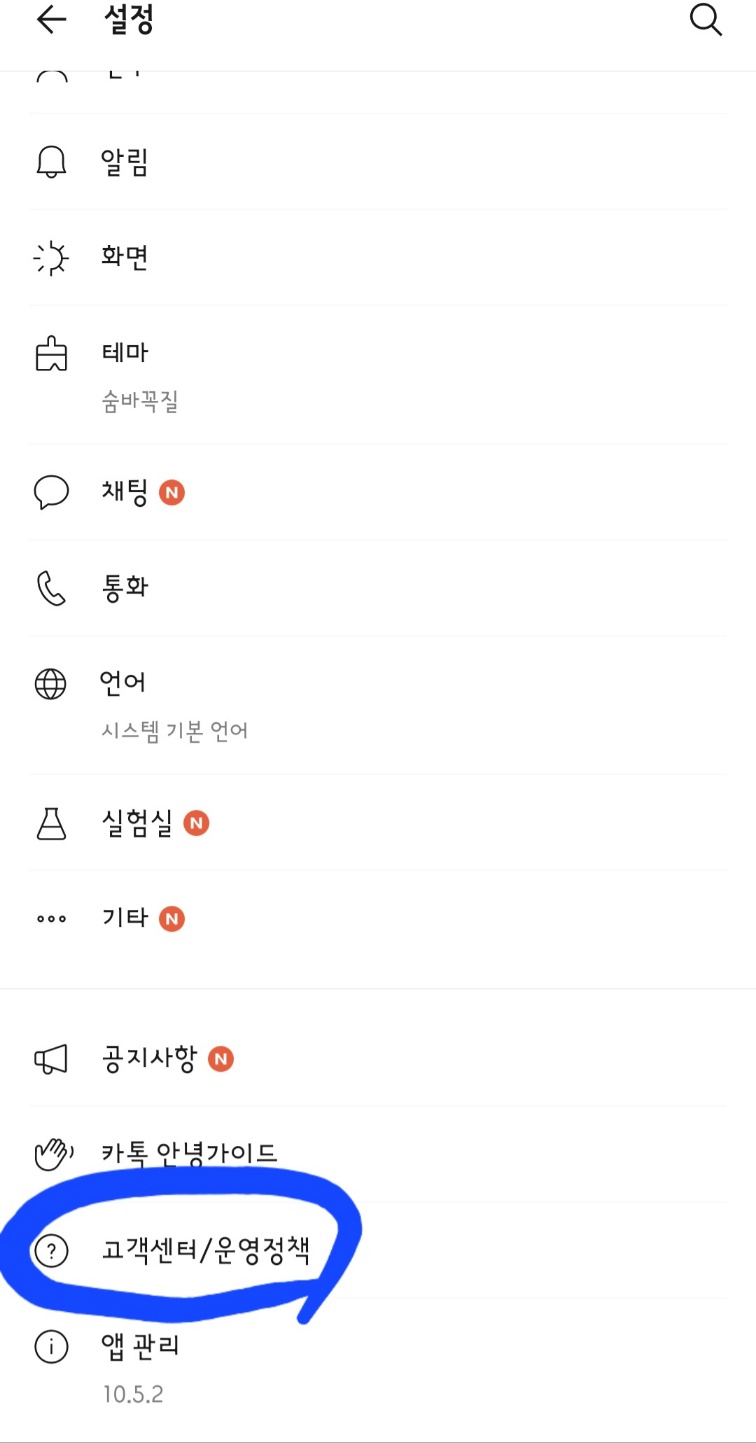 그리고 설정 화면에서 아래로 쭉 내려오면 고객센터/운영정책을 클릭합니다.